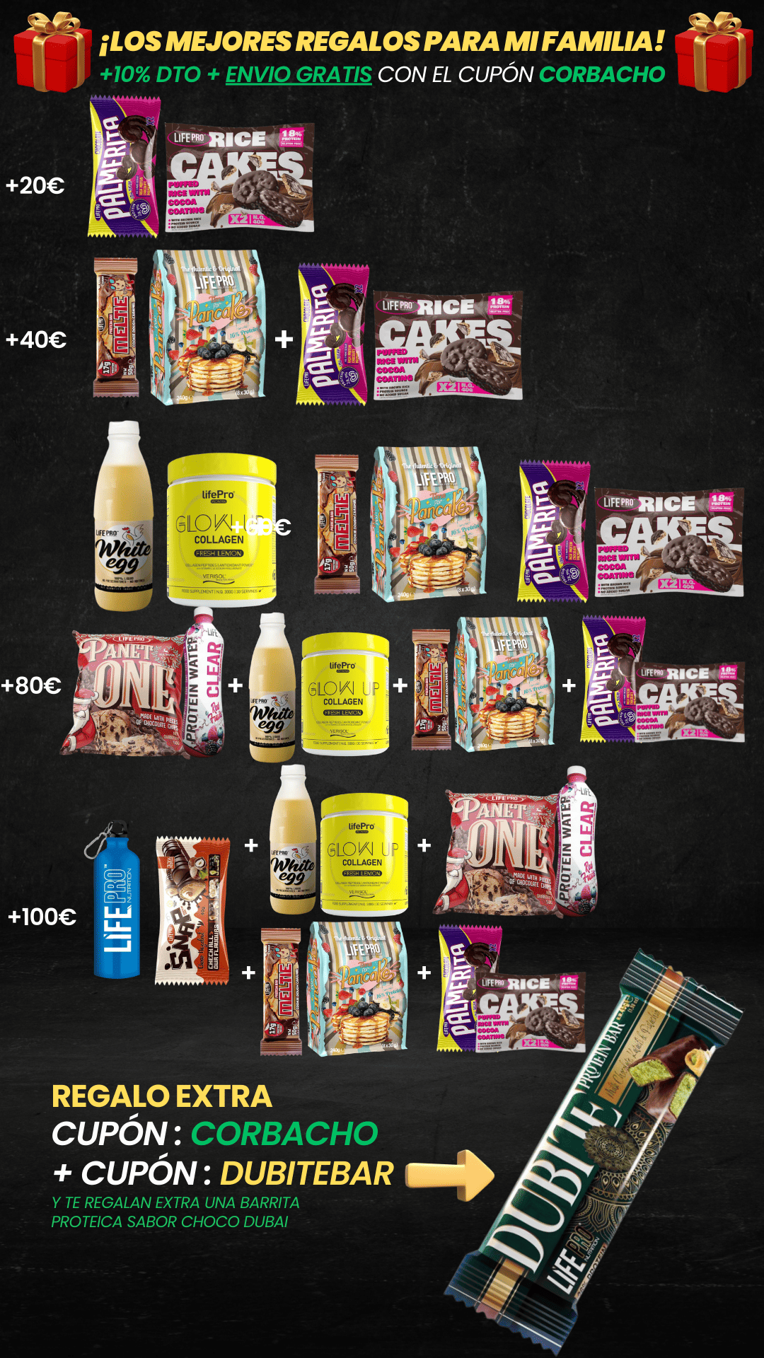 En todos los Pedidos pon el cupón CORBACHO + DUBITEBAR y te regalan Extra una barrita de prote sabor Choco Dubai!